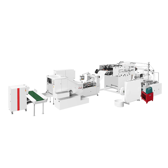 Пакетоделательная машина RZFD-330T действует по технологии, которая совмещает два цикла: изготовление заготовок ручек и изготовление пакетов. Ручки делаются из двух рулонов узкой бумаги и скрученной веревки, которые разматываются и подаются в секцию натяжения и склеивания (здесь используется аппарат нагревания и распыления клея, что существенно повышает прочность соединения), откуда передаются по двум каналам в линию изготовления непосредственно пакетов. Этот процесс включает: разматывание рулона, боковое склеивание, приклеивание предварительно разрезанных заготовок ручек, формования трубы, резки трубы на отдельные пакеты, формование дна, склеивания дна и выкладки пакетов на ленточный конвейер. Загрузка сырья осуществляется гидравлической автоподъемной структурой. Итальянский EPC-контроллер от компании SELECTRA сокращает время выравнивания материала, получая данные от немецких фотоэлектрических элементов Sick, и регулируя работу магнитно-порошковой тормозной муфты. На этапе регулирования размера сумки в секции конвертирования, а также на иных участках обработки задействуются немецкие сервомоторы LENZE.