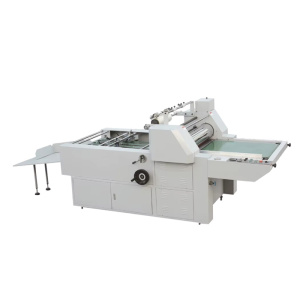 Промышленный ламинатор для бумажной продукции YFMB-1200D входит в серию из трех таких однотипных станков, у которых отличается в основном ширина операционной зоны, поэтому заказчик может подобрать наилучший для бизнеса вариант. Материал подложки укладывается на ленточный конвейер, который с регулируемой скоростью вводит заготовки в операционную зону. Здесь на первом этапе на картон наносится клей и он движется далее. Сверху из разматывающегося рулона в зону обработки подается пленка через систему натяжения. Она тоже подвергается покрытию клеем путем пропускания через валики, вращающиеся в ванночке. В зоне прессовки картон встречается с пленкой, они плотно сжимаются. В конце цикла пленка отрезается по длине листа подложки.