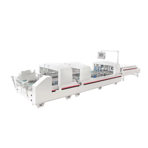 Непрерывная, точная и автоматическая подача обеспечивается за счет использования широкого несущего ремня с системой вакуумного всасывания. Фидер оснащается собственным электродвигателем с переменной скоростью (японский инвертер). Боковые рамки магазина легко регулируются по ширине заготовки. Скорость наружных складных ремней в секции предварительной формовки тоже можно регулировать, полностью избегая неправильно деформированной коробки. Третья линия складки предварительно сгибается до 135º. Вторая и четвертая складка составляют 180°. Узел прессования имеет пневматическое усиление, что обеспечивает очень плотное закрепление клея. Точность позиционирования отслеживается с помощью фотоэлектрических датчиков.