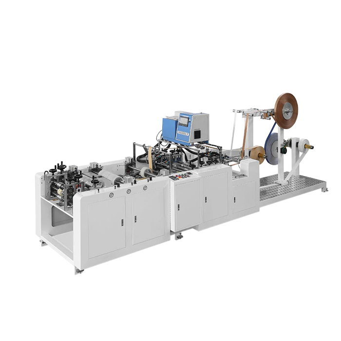 Автоматическая машина для изготовления плоских бумажных ручек RZBS-180M-1 действует по технологии, которая подразумевает использование в качестве первичного материала плоской рулонной бумаги, разматываемой с отдельной стойки при втягивании в операционную зону открытого типа (нет необходимости в каких-либо особых мерах безопасности для установки защитного короба вокруг станка). Заготовка ручки – это участок для взятия руки, помещенный путем вклеивания в основу. Вначале участок для руки делается путем продольного сгибания одной из лент, чтобы придать этому месту лучшую прочность, потом согнутая полоска нарезается на заданную программой длину и сгибается в U-образную форму. Такие отрезки разбираются захватами по бокам бегущего конвейера, после чего накладываются концами на одну из лент. На эту ленту предварительно был нанесен нагретый клей, дозированно подаваемый из блока для расплава гранул. Применение нагретого клея существенно повышает степень прочности соединения. После наложения ручки на одну из лент основы, сразу же сверху накладывается вторая лента основы, после чего это непрерывное соединение пропускается через несколько сжимающих роликовых прессов. Завешает процесс два вида ножевых механизмов. Первый в виде вертикально вращающегося диска, который делит полосу на две, а второй нож – в виде вала с лезвиями, который разрезает каждую полосу на отдельные заготовки.